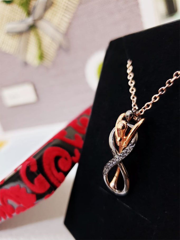 Üzerinde sonsuzluğun sembolü olan sonsuzluk işareti olan bu kolye sevgilinize olan aşkınızın sonsuzluğunu temsil eder.
